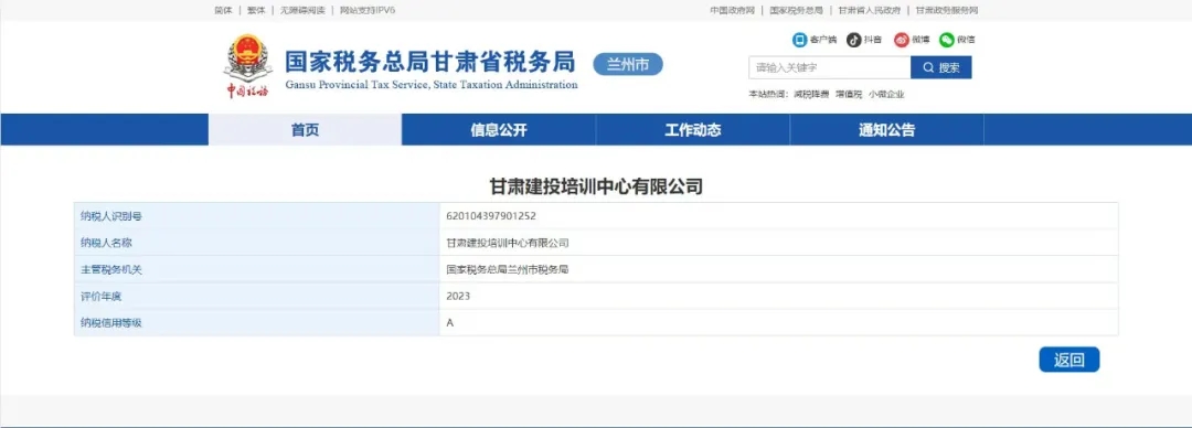 近日,國家稅務總局甘肅電子稅務局公布了2023年度企業(yè)納稅信用評級結果,甘肅建投培訓中心有限公司被評為“納稅信用等級A級納稅人”。至此,培訓中心已連續(xù)第五年獲此殊榮。