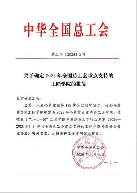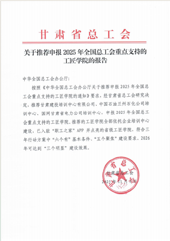 近日,從中華全國(guó)總工會(huì)傳來(lái)喜訊,甘肅建投培訓(xùn)中心有限公司憑借扎實(shí)的基礎(chǔ)建設(shè)與顯著的育人成效,成功獲批為“2025年全國(guó)總工會(huì)重點(diǎn)支持的工匠學(xué)院”。據(jù)悉,此次評(píng)選中,甘肅省僅有三家單位獲此殊榮。