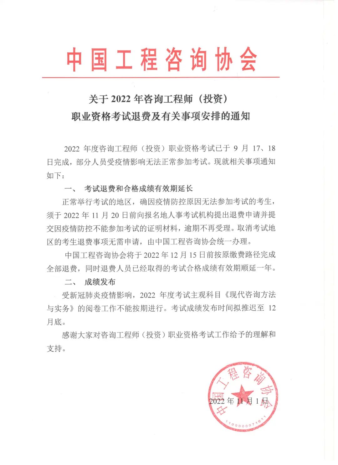 中國工程咨詢協(xié)會關(guān)于2022年咨詢工程師(投資)職業(yè)資格考試退費及有關(guān)事項安排的通知