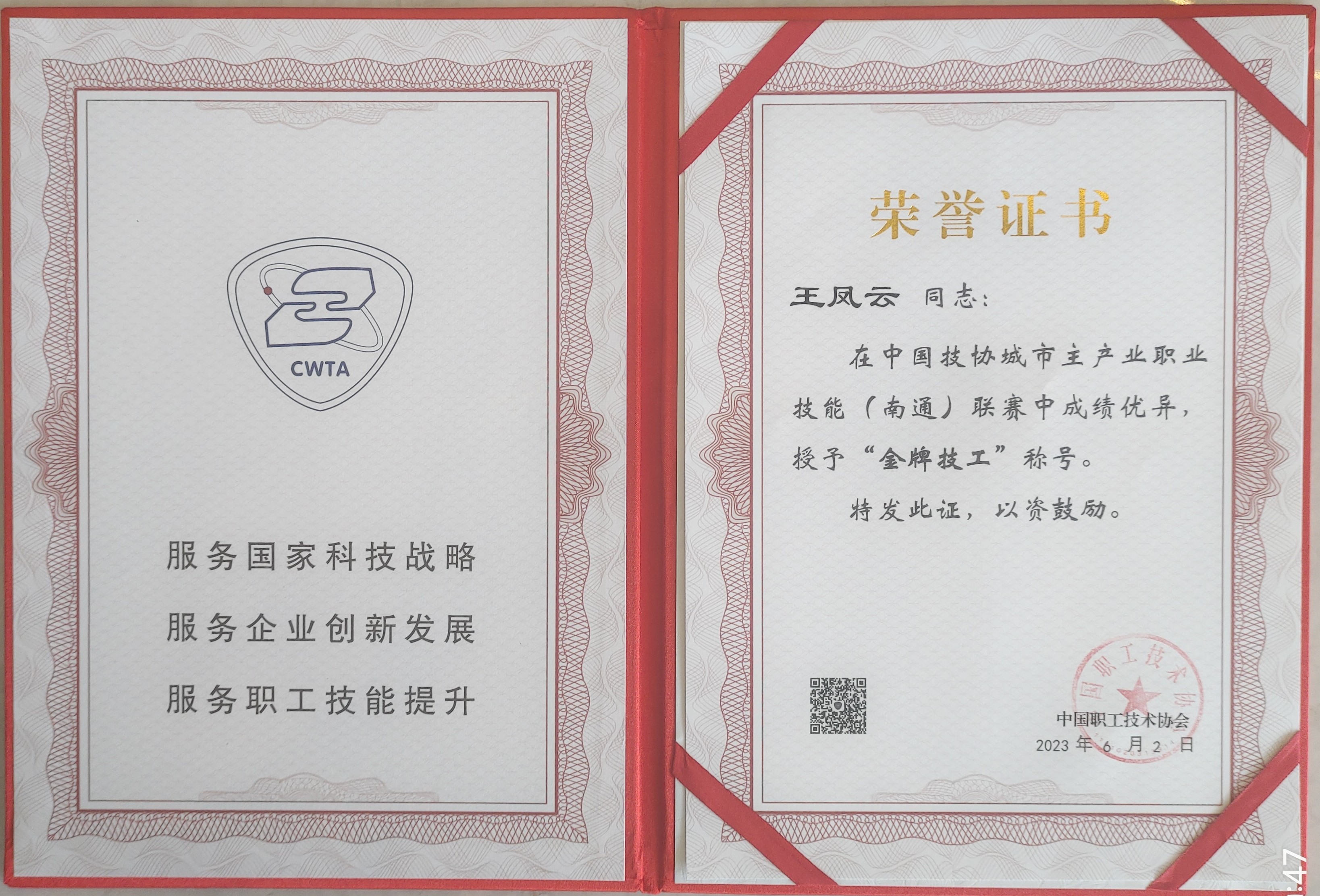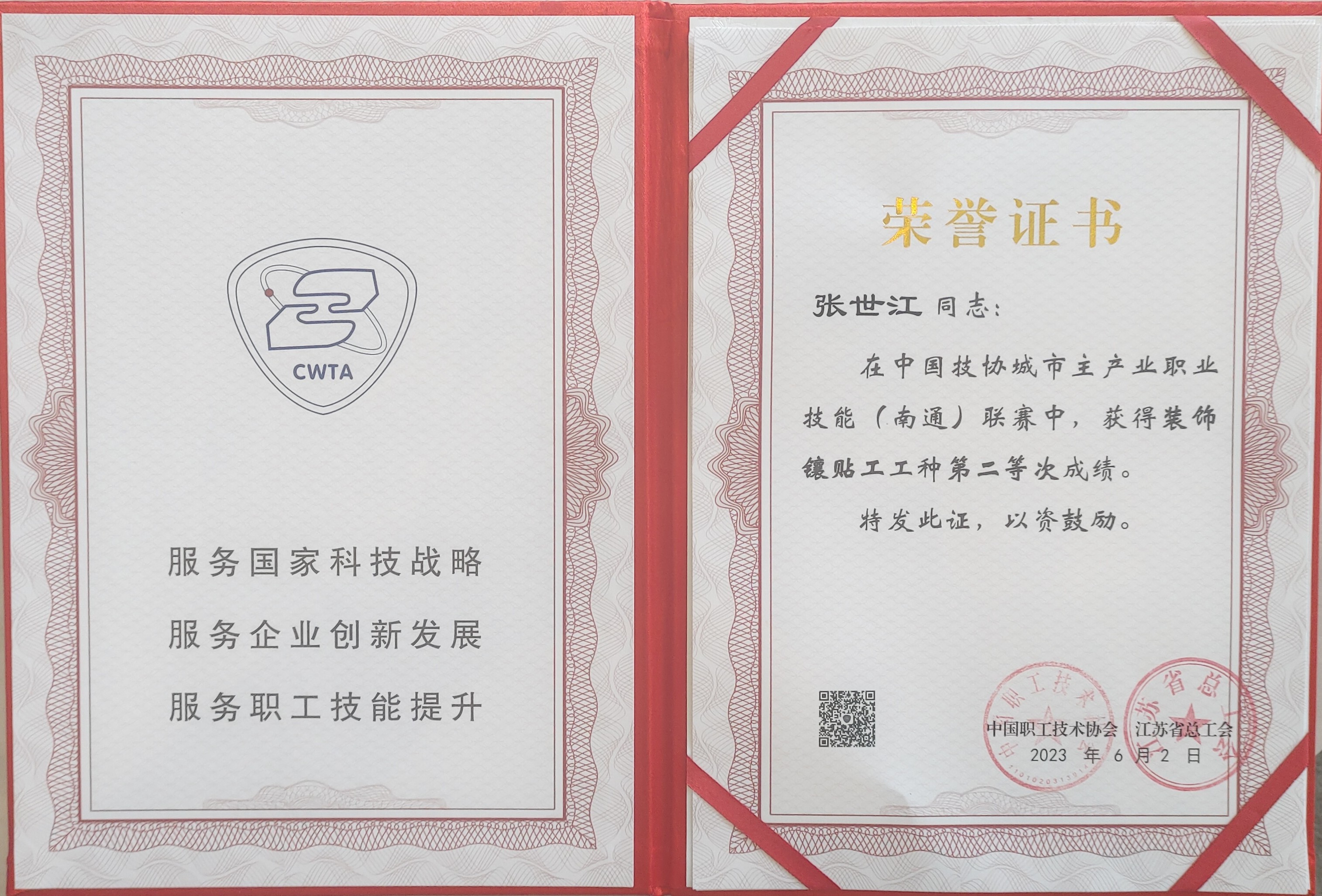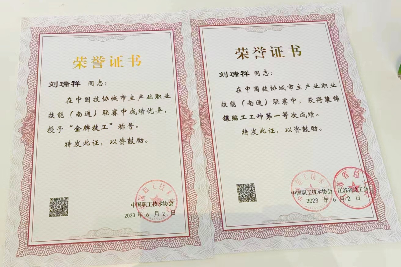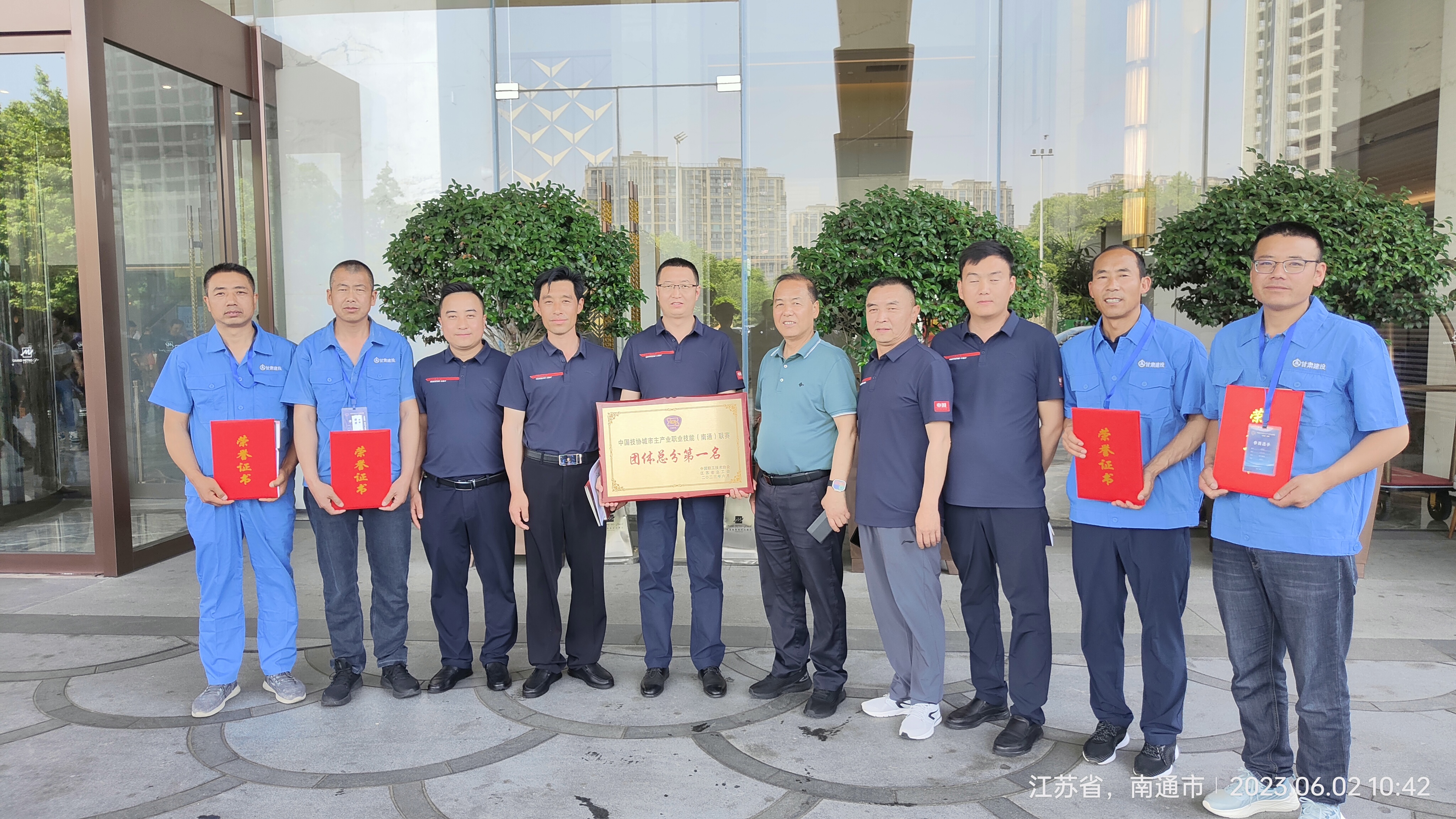 6月2日,參加中國技協(xié)城市主產(chǎn)業(yè)職業(yè)技能(南通)聯(lián)賽的甘肅建投代表隊(duì)獲得集體獎(jiǎng)項(xiàng)團(tuán)體總分第一名,甘肅建投代表隊(duì)砌筑工選手王鳳云(右2)獲得一等獎(jiǎng)(第4名)、鑲貼工選手劉瑞祥(左2)獲得一等獎(jiǎng)(第5名),均獲得金牌技工稱號(hào);砌筑工選手王浩全(右1)獲得二等獎(jiǎng)、鑲貼工選手張世江(左1)獲得二等獎(jiǎng),均獲得銀牌技工稱號(hào)。